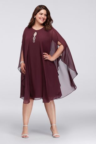 Very chic and a little groovy, a crystal keyhole details the neckline of this plus-size chiffon swing dress. A matching cape tops off the look.