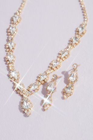 Your quincea era look will be even more regal when topped with this matching jewelry set, featuring a pear-cut-crystal encrusted necklace and earrings.