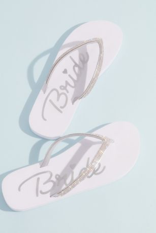Topped with crystal-encrusted straps and printed with the word \"bride,\" these flips flops are ideal for both your wedding reception and your honeymoon.