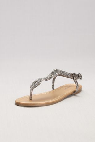 Crystal-Studded Scalloped Metallic T-Strap Sandals