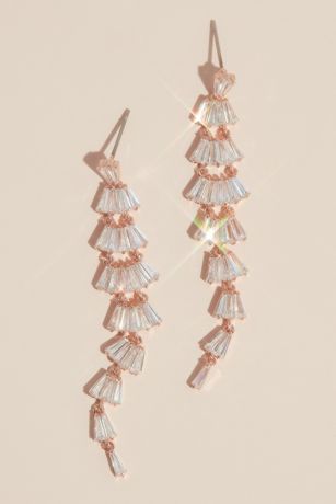A refreshing arrangement of fanned baguette crystals trails along these glittering drop earrings.