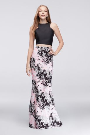 One of fashion's hottest trends, the crop top is a must-have for prom season. This two-piece dress features an angular, cutaway crop top and floral-printed mikado mermaid skirt.