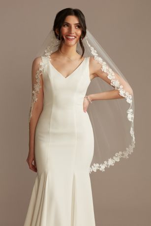 Cutout floral lace swirls along the edge of this floaty tulle fingertip veil.