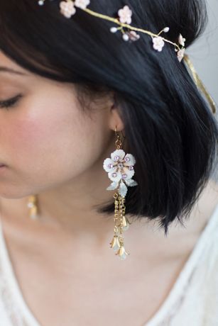 Hand-enameled flowers, delicate chains, Swarovski crystals, and teardrop pearls cascade from these handmade earrings.
