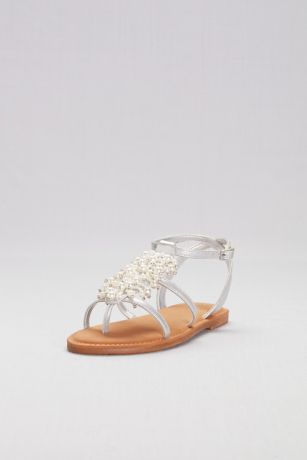 A gorgeous cluster of dangling pearls and crystals detail the vamp of this strappy metallic pair.