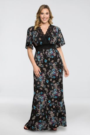 This beautiful printed plus-size maxi dress features flowy short sleeves, a lace-trimmed surplice neckline, and a flounced hem.