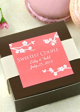 Personalized square adhesive labels add a fun and unique flair to your special day. With distinctive designs to match every event and style theme or season; saying thank you just keeps getting sweeter and sweeter! Personalized square adhesive labels compliment all types of favor boxes and tins; they even add a personal touch to gift bags and envelopes. This collection has many beautiful designs in Davids Bridal Exclusive colors to help you create a beautiful label that compliments your wedding theme or decor. Choose your names, a favorite quote or your initials to personalize your label. Your guests will notice and appreciate these eye-catching labels. Our labels have a beautiful high gloss finish that converts any favor into a unique inexpensive favor that everyone will enjoy!