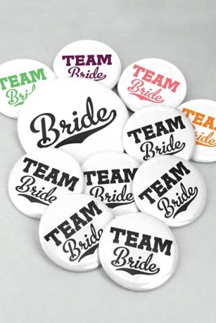 Round up your team! Our Team Bride buttons are a fun and festive way to start off any bridal shower or bachelorette party! One extra-large "Bride" button for the guest of honor is included in each pack of twelve "Team Bride" buttons. Each button arrives pre-assembled and features a solid white background, collegiate style text, and your choice of one of the many David's Bridal Exclusive ink colors.