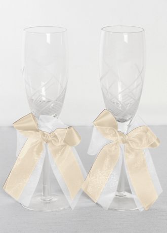 Exclusive for David's Bridal! Customize the beveled glass toasting flutes with organza ribbon layered into a bow with your choice of David's Exclusive satin ribbon. Flutes measure 9" tall and holds 6 ounces.