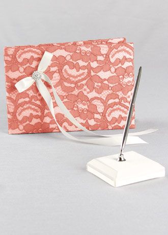 Covered with David's Bridal exclusive lace layered on satin this guest book and pen have the perfect vintage elegant charm. Embellished with a rhinestone pave button and satin bow this set is the perfect compliment for your wedding day.