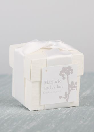 Kit includes: box and lid, 1" W double-faced satin ribbon in your choice of one of David's Exclusive colors, matching personalized non-adhesive tags and glue dots. Favor box measures 2" L x 2" W x 2" H.