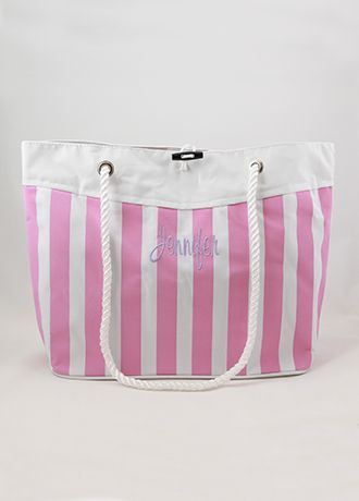 Our generously sized, nautical striped tote features an interior mesh pocket, toggle closure and long rope straps. Personalize each bag with your bridesmaids' names and give to them as a gift.