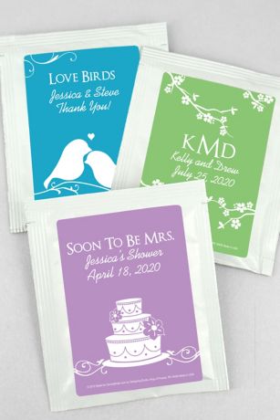 Personalized Tea wedding favors bring a dramatically different flair to your special occasion... perfect for any wedding... creating casual elegance and complimenting your event! Tea is becoming the in drink of this decade. Perfect for brides and grooms looking to give their guests something unique to remember their happy occasion tea wedding favors are a Tea-rific way to say thank you for sharing in our special day. Providing a rich traditional blend of black tea allows your guest to enjoy a warm relaxing delicious treat while reminiscing about your wedding. Choose the perfect design to match your theme and personalize it by selecting your color from a variety of David's Bridal Exclusive ink colors.