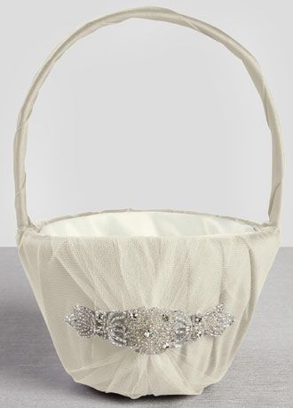 Wrapped in delicate ivory tulle gathered over rich champagne satin, this flower girl basket is an elegant yet classic design. An elaborate rhinestone and beaded applique is the perfect embellishment for this radiant vintage style basket.