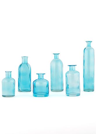 This set of decorative bottles is so versatile and can be adapted to accommodate a wide range of decorating ideas. Whether used to display fresh flowers, natural branches, or used alone, the variety of shapes and sizes of these bottles will add great dimension to your centerpieces.