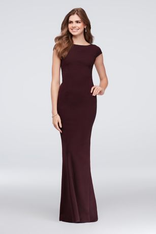 Deep-V Bow Back Cap-Sleeve Crepe Sheath Gown