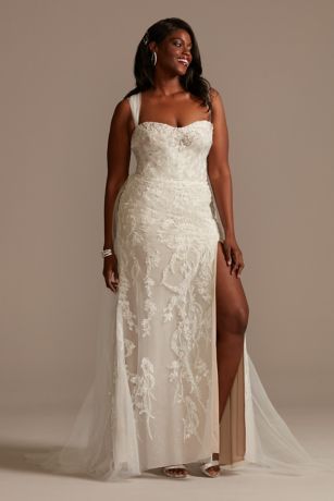 Embroidered vines and florals, embellished with over 4,000 shimmering sequins, crystals, and beads, cascade down this tulle wedding dress. Add or remove the detachable chapel-length train and draped tulle shoulder swags to unveil multiple looks on your wedding day.