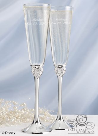 You've found your prince and it's a dream come true! Soon you'll be at your reception, toasting your love for each other with these romantic Disney toasting flutes. The silver-plated stems gradually rise to the shape of a heart, accented with an embossed flourish pattern. Add two lines of your personalization to be engraved on each glass as a sweet memento of your wedding day.