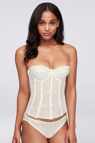 This super-shaping corset-style torsolette provides complete figure control, with close-set boning and three-section fiber-fill cups for smoothing and concealment. The low-cut power-net back panel shapes and supports, and is perfect for wear with strapless gowns. Sheer and alluring, this longline corset is crafted of floral-embroidered lace.