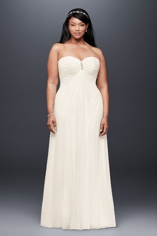 A soft and flowy empire-waist wedding dress, crafted of clipped-dot chiffon over satin lining, with a pleated sweetheart bodice accented by a sparkling brooch.