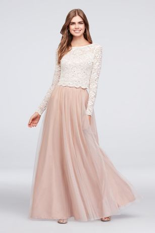 A perfect pairing of glitter lace and glitter-dotted tulle, this two-piece dress features a scalloped V-back top and flowing, floor-length skirt.