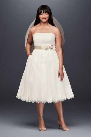 Perfect for simple weddings or pre-wedding events, this dotted tulle tea length dress has the lacy bodice and hem detail of a formal gown with the ease of a short silhouette.