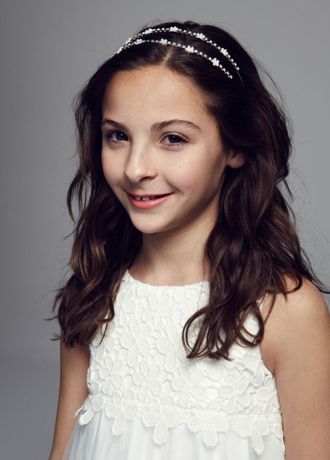 Your flower girl's smile will be just as captivating as the details dazzling on this double row headband with mini pearl flowers and crystal applique.