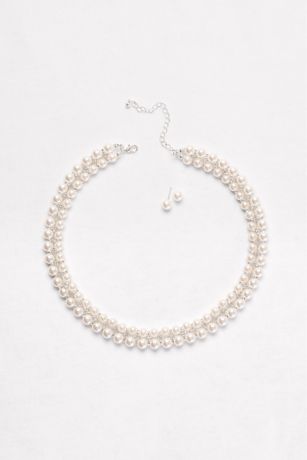 A double-row pearl collar exudes feminine charm, especially when it's paired with sparkling crystals. Matching pearl posts complete the look.