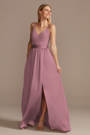 Crafted with a moss crepe bodice and a lustrous matte charmeuse skirt, this radiant bridesmaid dress will be adored by every bridesmaid. A high-shine sash adds a waist-cinching touch between the double spaghetti strap bodice and slit-accented skirt. Plus, it has pockets!