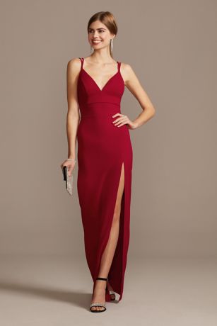 Unembellished but far from boring, this flirty gown has skinny double spaghetti straps and a deep-V neckline, outlined with seams at the bodice. A super-high skirt slit gives the slim, column skirt extra wow-factor (and an opportunity to show off some statement shoes!).
