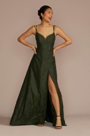 The double spaghetti straps on this A-line gown give it a modern and stylish touch, while the v-neckline adds a hint of sophistication. The airy lace fabric drapes beautifully, creating a romantic and ethereal look that is perfect for any formal occasion. Whether you're walking down the aisle or attending a special event, this dress is sure to make you feel elegant and confident. Pair it with some delicate jewelry and a chic updo to complete the look. You'll be turning heads all night long in this stunning and versatile occasion wear from David's Bridal.