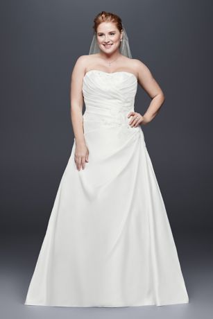 Crisscross pleating creates a figure-flattering bodice and a softly draped skirt on this plus-size satin wedding dress.