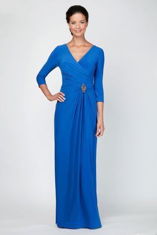 A surplice neckline, elegant draping, three-quarter sleeves, and a beaded waist all come together to create this exquisite jersey A-line dress.