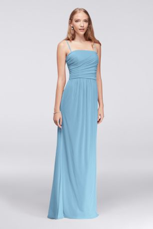 The straight-cut bodice of this long, soft mesh dress drapes beautifully from sleek spaghetti straps. Pair it with a simple string of pearls or go bold with chunky statement gems.