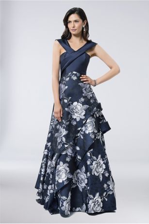 Unique asymmetrical draping on the bodice and cascading folds on the tiered, floral jacquard skirt make this ball gown a dramatic choice for the mother of the bride, or any guest of a special event.