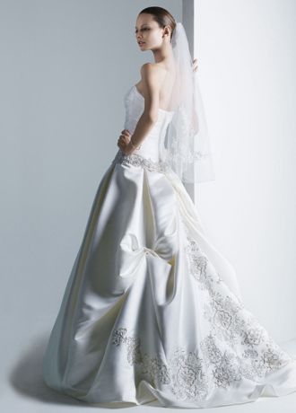 Draped satin bodice with slightly dropped waist featuring beaded embroidered detail, ball gown skirt with allover beaded lace train.