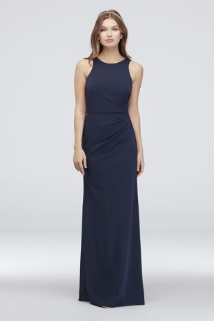 Simple and sophisticated, this stretchy scuba crepe mermaid dress features a high neckline and elegant side pleating at the waist.