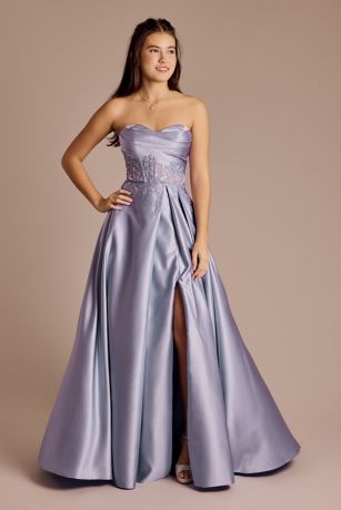 This luxurious strapless ball gown showcases an elegant sculpted strapless neckline, illusion waist with floral appliques, and a full skirt that flows gracefully, making it an enchanting choice for any grand occasion, prom included!