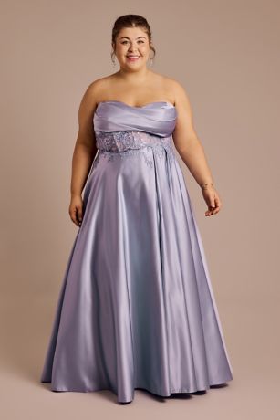 This luxurious strapless ball gown showcases an elegant sculpted strapless neckline, illusion waist with floral appliques, and a full skirt that flows gracefully, making it an enchanting choice for any grand occasion, prom included!