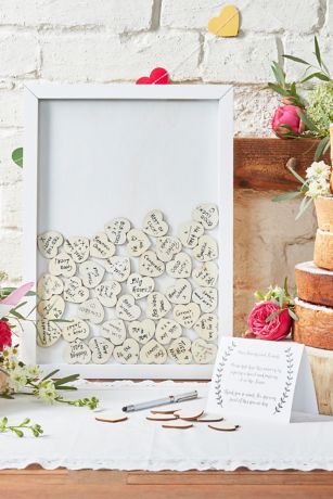 This wooden frame offers a lovely alternative to a traditional guest book. Guests can write messages on the wooden heart pieces, which then slot into the frame.