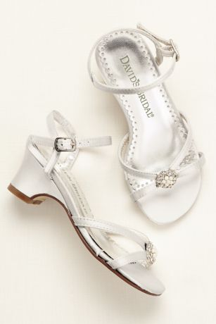 This heeled flower girl sandal is adorned with a pearl brooch.