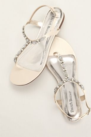 - Satin t-strap sandal encrusted with sparkling crystals and opulent pearls.