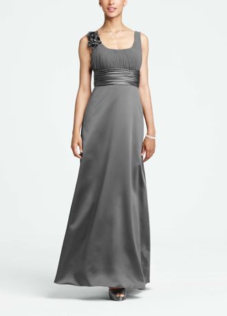 - Ruched waist is flattering and flows into a full satin skirt to create a beautiful contrast of fabrics.