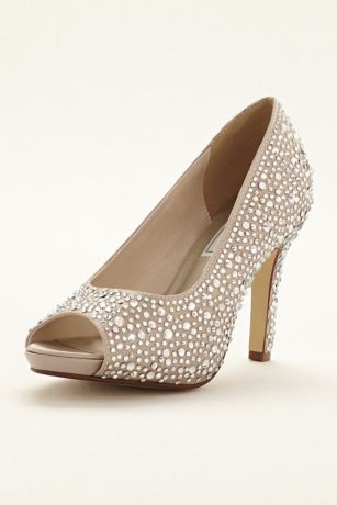 - Peep toe platform pumps are adorned with crystal accents throughout.
