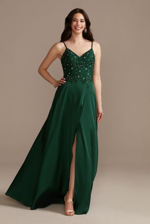 All eyes will be on you in this fun-loving spaghetti strap gown, embellished with corded lace and iridescent crystals at the bodice. Best for prom or any formal event.