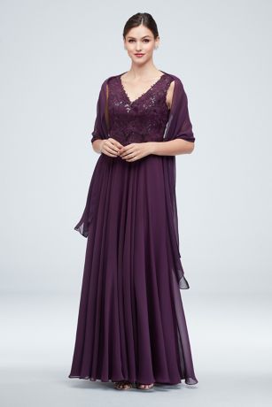 This elegant gown blends a sequin-embellished brocade bodice with the beautiful, flattering combination of cap sleeves and a plunging-V neckline. A flowy skirt cascades from the asymmetrical waistline embellishment to complete the look.