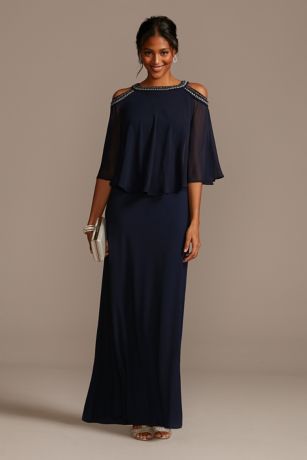 A sleek floor-length gown is topped with a sheer chiffon faux capelet, finished with rows of shimmering stones and crystals along the circle neckline and cold shoulder-cutouts.