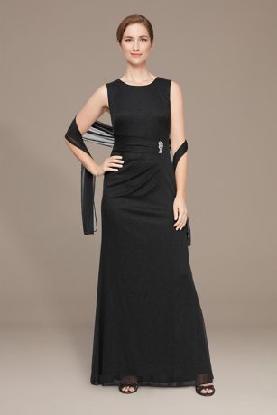 A sparkling embellishment doubles the shine on this glitter mesh sheath gown. When the temperature drops, the matching shawl has you covered.