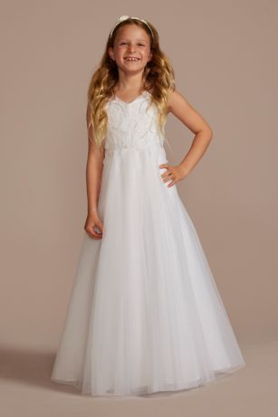 Stunning hand placed lace appliques adorn the bodice of this cap sleeve flower girl dress. The glitter tulle ball gown skirt and open keyhole back mimic wedding gown style SWG862 for the cutest coordination.
