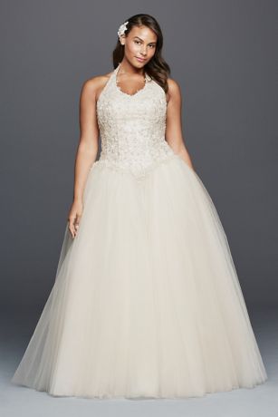 Make your grand entrance and channel royal appeal in this tulle halter wedding dress. Featuring a basque waist, beaded embroidery, and ball gown silhouette this gown will be cherished for years to come.